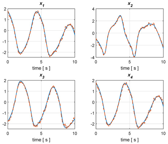 Simulation run at regime with uniformly distributed noises , , in , , where the state variables are in blue and their estimates are in dashed red.
