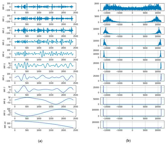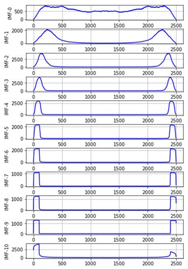 The results of the convolution of IMFs and the Gaussian kernel function are shown in Figure 2. It can be clearly seen that the IMF-0 component contains a wider band of frequency components. In contrast, the frequency components contained in IMF-1 and IMF-2 are significantly reduced, but there are still long tails in the cutoff band. Differently, as for IMF-3 and IMF-4, the downhill is significantly steeper, indicating that fewer frequency components are included. Furthermore, for IMF-5–10, the downslope is almost vertical, and we can find that the fluctuations of these components in the time domain map (Figure 1a) are relatively flat.
