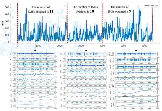 Moreover, we found that the number of IMFs varies for different time periods. The decomposition result of the EMD algorithm depends on the original time series itself. The number of IMFs obtained by EMD is usually different within different prediction intervals. As shown in Figure 3, we performed EMD on the three different data intervals [0, 2400), [2400, 4000), and [4000, 6400) of thePM2.5 data, and the number of IMFs obtained was 11, 10, and 9, respectively.