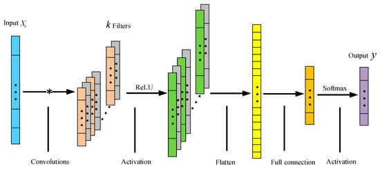Then by flattening and full connection process [48], a one-dimensional convolutional neural network extracts the frequency characteristics of the IMFs, the Softmax classifier, classifies the features and finally achieves the network output, i.e., the labels of each IMF. The schematic of the one-dimensional CNN is shown in Figure 4, where is the input IMF sequence, and is the output label of each IMF. In consequence, the IMFs in each group will be added (noted as ) and as the input data for the GRU network.