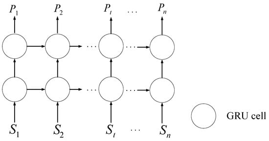 where is the input vector to each GRU cell; , , , and stand for the update gate, reset gate, candidate state of the current hidden node, and the active state of the current hidden node output at time , respectively; and are weight matrices to be learned during model training; represents bias vectors; is an element-wise multiplication; and and are activation functions. The GRU is trained by the gradient descent algorithm, and the parameters are continually updated until convergence. The proposed methods proposed in this paper can combine other identification approaches [50] to study the modeling and prediction problems applied to other fields [51,52] such as internet of things systems [53,54] and water environment prediction and management control [55,56].