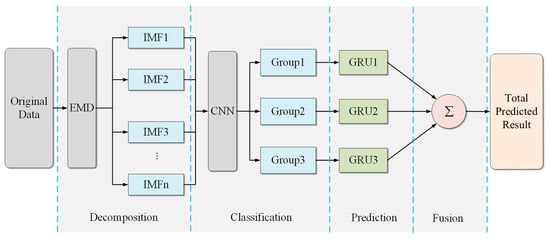 The proposed predictor has a hybrid structure, in which the data are decomposed by EMD to reduce their nonlinear complexity, and then the IMFs’ frequency characteristics are analyzed, and all the components are divided into a fixed number of groups by CNN networks. For each group, the deep learning network GRU is used to model and predict, and finally, all the predictions of GRU are added to obtain the prediction result. Next, we will detail each part of the proposed model and provide its flowchart.