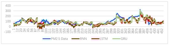 The predictions of hourly PM2.5 in Beijing from 1 to 20 December, 2017 by RNN [31], LSTM [32], GRU [34].