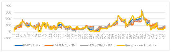 In this experiment, in addition to the proposed method, six other models are used to predict 24 h ahead of the PM2.5 average concentration, which are RNN [31], LSTM [32], GRU [34], Decomposition-ARIMA-GRU-GRU [35], and after decomposing the data by EMD and classification of CNN firstly, RNN [31] and LSTM [32] as the sub-predictors, respectively. The PM2.5 data introduced in Section 4.1 is used to show the prediction result. Figure 7 and Figure 8 give the predictions of hourly PM2.5 average concentration data in Beijing from 1 to 20 December, 2017 by RNN [31], LSTM [32], GRU [33], EMDCNN_RNN (EMD and CNN-based RNN), EMDCNN_LSTM (EMD and CNN-based LSTM), and the proposed method.