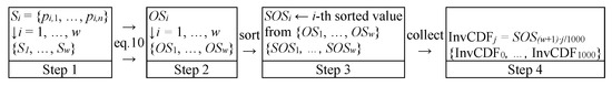 Let us take a sample size of n. The MC simulation needs to generate a large number of samples (let the number of samples be m) drawn from uniform continuous distribution ( in Equation (2)). To ensure a good quality MC simulation, simply using a random number generator is not good enough. The next step (Equations (10)–(12) do not require this) is to sort the probabilities to arrive at from Equation (4) and to calculate an (an order statistic) associated with each sample. Finally, this series of sample statistics ( in Figure 1) must be sorted in order to arrive at the population emulated distribution. Then, a series of evenly spaced points (from 0 to 1000 in Figure 1) corresponding to fixed probabilities (from to in Figure 1) is to be used saving the ( statistic, its observed probability) pairs (Figure 1).