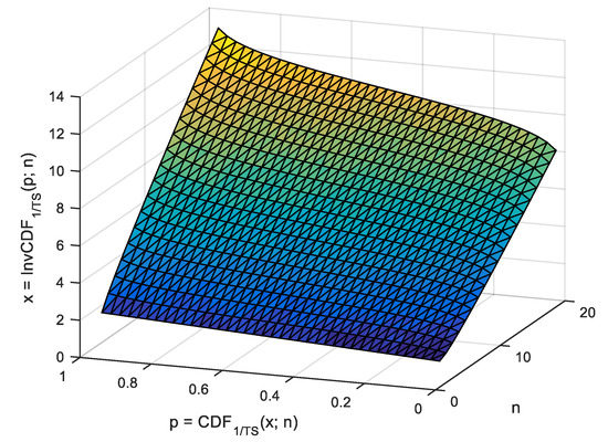 The of depends (only) on the sample size (n), e.g., . As the proposed equation, Equation (12), resembles (as an inverse of) a sum of normal deviates, we expected that the will also be connected with the Irwin–Hall distribution, Equation (18). Indeed, the conducted study has shown that the inverse () of the variable (x) following the follows a distribution () of which the is given in Equation (19). Please note that the similarity between Equations (18) and (19) is not totally coincidental; (see Equation (12)) is more or less a sum of uniform distributed deviates divided by the highest one. Also, for any positive arbitrary generated series, its ascending (x) and descending () sorts are complementary. With the proper substitution, can be expressed as a function of —see Equation (20).