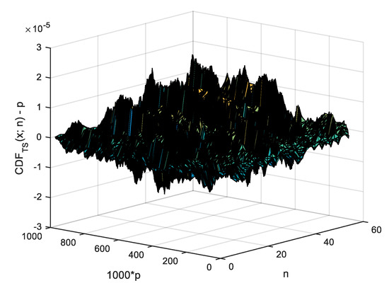 The associated objective (with any statistic) is to obtain its and thus, by evaluating the for the statistical value obtained from the sample, Equations (5)–(12), to associate a likelihood for the sampling. Please note that only in the lucky cases is it possible to do this; in the general case, only critical values (values corresponding to certain risks of being in error) or approximation formulas are available (see for instance [1,2,3,5,7,8,9]). When a closed form or an approximation formula is assessed against the observed values from an MC simulation (such as the one given in Table 1), a measure of the departure such as the standard error () indicates the degree of agreement between the two. If a series of evenly spaced points ( points indexed from 0 to in Table 1) is used, then a standard error of the agreement for inner points of it (from 1 to , see Equation (13)) is safe to be computed (where stands for the observed probability while for the estimated one).