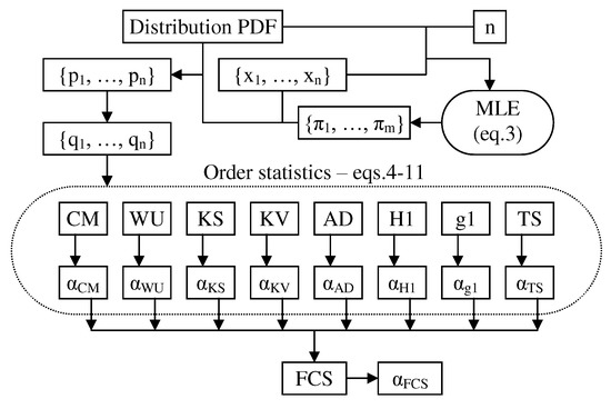 With any of Equations (5)–(12), a likelihood to observe an observed sample can be ascertained. One may ask which statistic is to be trusted. The answer is, at the same time, none and all, as the problem of fitting the data to a certain distribution involves the estimation of the distribution’s parameters—such as using MLE, Equation (14). In this process of estimation, there is an intrinsic variability that cannot be ascertained by one statistic alone. This is the reason that calculating the risk of being in error from a battery of statistics is necessary, Equation (15).
