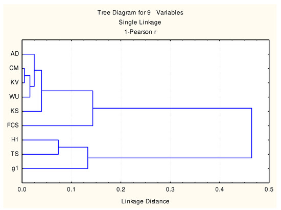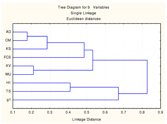 Both clustering methods illustrated in Figure 11 and Figure 12 reveal two distinct groups of statistics: {AD, CM, KV, WU, KS} and {H1, TS, g1}. The combined test FCS is also attracted (as expected) to the largest group. When looking at single Euclidean distances (Figure 11) of the largest group, two other associations should be noticed {AD, CM, KS} and {KV, WU}, suggesting that those groups carry similar information, but when looking at the Pearson disagreements (Figure 12), we must notice that the subgroups are changed {CM, KV, WU}, {AD}, and {KS}, with no hint of an association with their calculation formulas (Equations (5)–(9)); therefore, their independence should not be dismissed. The second group {H1, TS, g1} is more stable, maintaining the same clustering pattern of the group ({H1, TS}, {g1} in Figure 12).