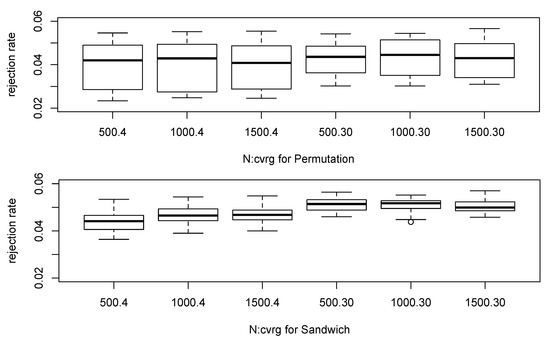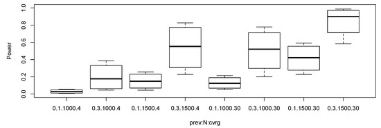 We used the same parameter settings as in the null simulation study. Additionally, we set multiplicative genetic relative risks vector in the alternative parameter configurations. In the alternative simulations, we calculated empirical rejection rates under Bonferroni corrected level of significance, that is, . Figure 2 shows the boxplots of empirical power under various alternative settings. We removed the results when the sample size was 500 or the minor allele frequency was 0.05 since all the rejection rates were small in Figure 2. It appears interesting that the power of the proposed test when the coverage was 4× and the sample size was 1500 is higher than the power of the test when the coverage was 30× and the sample size was 1000. If the two design costs are similar, then the low-coverage with more samples seems more effective than the high-coverage with less samples.