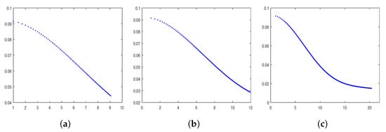 for . From Equation (31), we know that the relaxation factor , then we choose . When constant , , and noise level , it follows from Equation (28) that .