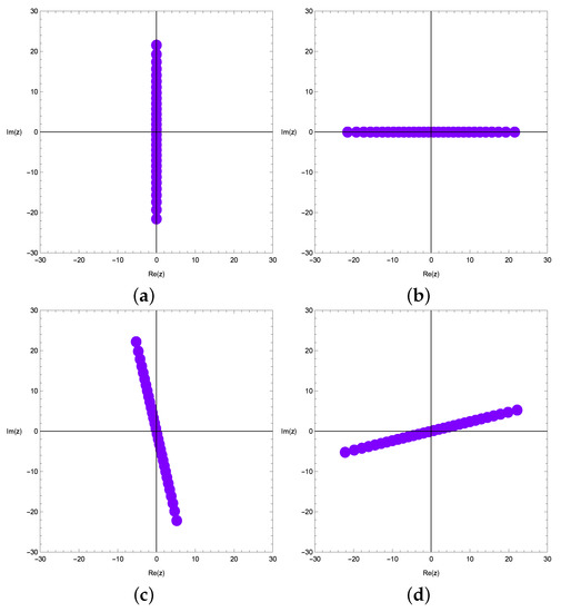Zeros of . (a) and ; (b) and ; (c) and ; (d) and .