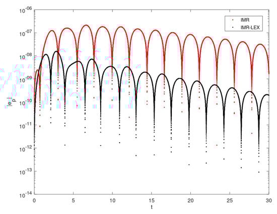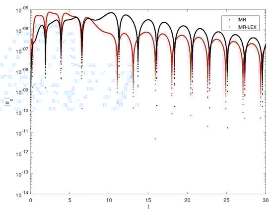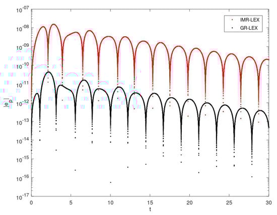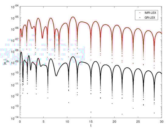 Section 5: implicit midpoint rule (IMR), discrete gradient scheme (GR), locally exact implicit midpoint rule (IMR-LEX) and locally exact discrete gradient scheme (GR-LEX). In all cases, the time step