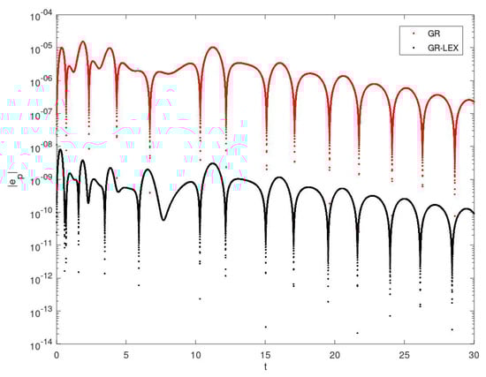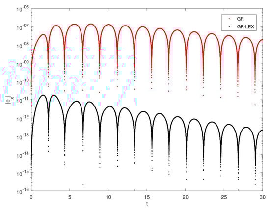 Figure 1. The accuracy of the discrete gradient scheme for the same initial conditions is improved by about 3 orders of magnitude, see