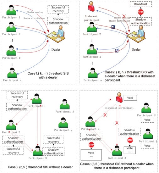 For example, see Case 4 in Figure 2— for threshold SIS without a dealer when there is a dishonest participant. Suppose that Participant 2, Participant 3 and the dishonest participant send their shadows to each other at the same time. If every shadow gain two votes from other two participants, the shadows are authenticated successfully. Otherwise, we proceed with the authentication procedure with the help of Participant 4 and Participant 5.