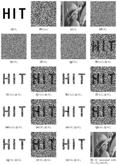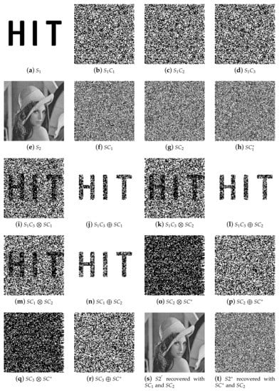 Figure 4 exhibits the results of threshold SIS authentication with dealer-participatory and non-dealer-participatory mutual shadow authentication capabilities, the binary authentication image is shown in Figure 4a and the input secret image which is grayscale is displayed in Figure 4e. Figure 4b–d denotes the output binary shadows , , , where is the binary authentication shadow assigned to the dealer. Figure 4f–g presents the outputs of two shadows and . Figure 4h illustrates a fake shadow which is denoted by . Figure 4i–l denotes the recovered binary authentication images obtained through the stacking and XORing operations of and , , respectively, where the recovered binary authentication image can be well recognized; thus, the shadows and are authenticated by the dealer. Meanwhile, participants holding the shadows and can verify the credibility of the dealer responsible for recovering secret image. Figure 4m,n denotes the recovered binary authentication images obtained through the stacking and XORing operations of and , respectively, where the recovered binary authentication image can be well recognized; thus, the shadows and are authenticated. In other words, the two participants are mutually authenticated successfully. Suppose there is an attacker posing as Participant 1, or that Participant 1 is an dishonest participant who sends a fake shadow to other participants or the dealer. The recovered binary authentication images with and , by stacking and XORing, respectively, are presented in Figure 4o–r, and it is obvious that the binary authentication image is not disclosed or recovered, and thus the shadow is fake. Figure 4s exhibits the secret image reconstructed with the two shadows by Lagrange interpolation, and we can see that the secret image is reconstructed losslessly. Figure 4t demonstrates the secret image recovered with and by Lagrange interpolation operation, which is not recognized as the secret image; thus, the recovery is failed. Additional instructions are needed here. In our scheme, participants exchange and authenticate their shadows’ LSB planes mutually in the case of non-dealer-participation. In the case of dealer-participation, the dealer authenticates the LSB planes of shadows sent by participants. Thus, the and we are talking about here are actually the LSB planes of them.