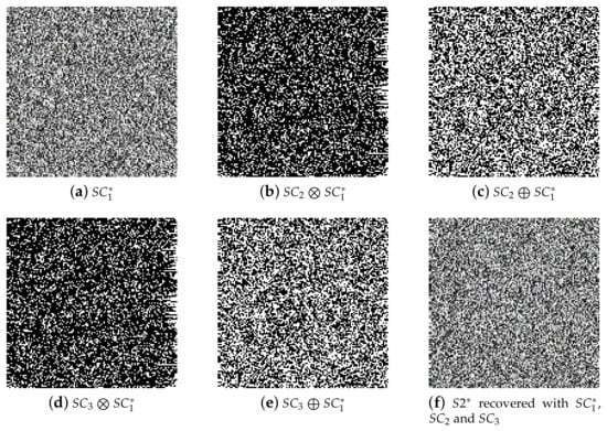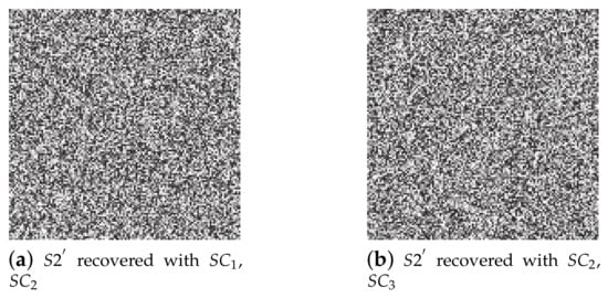 Recovering phase: as Equation (3). For example, suppose the value of a secret pixel of is 1; then, the recovered bit is always black. While the value of a secret pixel is 0, the reconstructed bit has a 50% chance to be black or white since is pseudo-randomly generated.