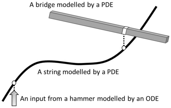 The above three types of coupled systems often appear in industrial simulations. For example, let us consider simulations of the stringed musical instruments, such as the guitar and the piano [9]. The one side of strings of these instruments are typically attached to a bar-shaped part of the instruments, which is called the bridge. Each string and the bar are modeled as infinite-dimensional natural systems and they are in contact at a single point. Hence, this case corresponds to the interaction between two PDEs. Meanwhile, the strings of the piano are excited by the hammer, which is modeled as the interaction between a wave-type PDE (a model of each string) and a mass–spring ODE (a model for the hammer) (see Figure 1). In addition, designing numerical schemes for the above two cases often reduces to the case of interconnections between two ODEs by semi-discretization in space (cf. Section 4).