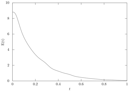 Although this causes an energy exchange, the total energy is preserved up to the rounding errors, as shown in Figure 4. In addition, in this example, if the energy is bounded, then , , , , , and are all bounded. In fact, the stability of the numerical scheme follows from these conservation laws because combined with the Dirichlet boundary condition and the boundedness of and shows that and are also bounded from the discrete Poincaré inequality [13].