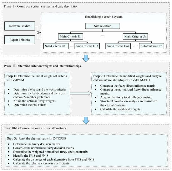 In order to scientifically carry out the location selection project and ensure the creditability of decision-making results, the evaluation framework proposed in this study is divided into three phases: (1) Construct a criteria system and case description; (2) determine criterion weights and interrelationships; (3) determine the order of site alternatives. In phase one, a specific inland NPP indicator framework is established as shown in Section 2.2, which will be the basis for the following phases. In phase two, Z-BWM is applied to obtain the initial weight coefficient of evaluation criteria. Subsequently, it is more important to analyze criteria interrelationships with Z-DEMATEL, and determine the modified weights. In phase three, Z-TOPSIS is used to determine the order of site alternatives. From a methodological point of view, the proposed multi-criteria decision support framework for inland NPP site selection comprises the following steps, as presented in Figure 1.