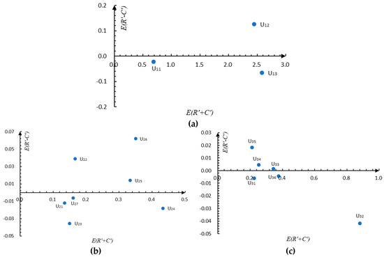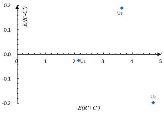Using Equation (13), the sum of rows and columns is expressed as vector and vector , respectively. After that, the fuzzy ordered pairs are obtained, and the expected values of and are calculated using Equation (9).