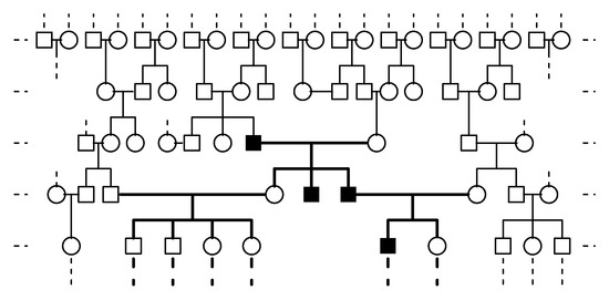 All those studies considered two-sex monogamous populations, i.e., one individual can mate with at most one individual of the opposite sex, forming a couple or mating unit, which gives rise to female and male offspring with different genotypes according to certain inheritance rules. Each couple is classified according to its components’ genotypes. The total number of different types of couple formed in a generation depends on the total number of females and males in that generation and is determined by the mating scheme (preference or blind choice) that defines the sexual interaction. Those studies considered an overall population, dealing with such problems as its extinction, the fixation of specific alleles, the coexistence of different alleles, their rates of growth, etc. In many real cases, however, only a part of the population was observed, usually a pedigree or a family tree (see, for example, in [18,19,20] for human populations and [21,22,23,24,25,26] for populations of other animals) related to a target genetic trait (usually originating from mutation), so that the total number of females and males in the overall population to which the pedigree belongs is unknown. The pedigree usually has its own characteristics since, for example, mating with relatives (i.e., individuals within the pedigree) may be forbidden so that external individuals to the pedigree from the rest of the overall population have to be chosen as mates. These features are shown in Figure 1, which illustrates the evolution of the first generations of a simulated Y-linked pedigree evolving within an overall population. Notice that, in this genetic framework (the Y-linked gene case), the evolution of the number of carriers of different genotypes in the overall population could be modeled by the Y-linked two-sex BP with the mutant allele that was introduced in [16]. If one is dealing only with a pedigree, however, this is not the case either with the aforementioned model or with other Y-linked two-sex BPs without mutation. The reason is that the total numbers of females and of each type of male are unknown. This also implies that the inferential methods developed in [27,28,29,30,31] are inadequate to quantify the presence of the different alleles of the gene within the Y-linked pedigree.