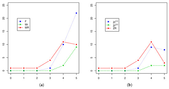 The values of the β parameters may be determined in many different ways depending on the population one is modeling. For example, if the behavior of the individuals in the population is that every individual that can mate mates (and this behavior is also followed by the individuals of the pedigree), i.e., the population evolves as a two-sex BP with perfect fidelity mating (see [11]), then, when, it would be reasonable to consider thatand, because the total number of females is eventually greater than the total number of males in the survival set of the population, and then eventually, all males mate, and the ratio between males and females in the population stabilizes at around(see [32]). Analogously, when, and are reasonable choices since the total number of males is eventually greater than the total number of females in the survival set of the population, and in the mating process, there is no preference for either one of the alleles. Nevertheless, in some situations, R-males may be preferred by females as mates. In this case, the reasonable choice for would be . Notice that these examples of modeling have some similarity with those given in [15] for “blind choice” mating and in [14] for mating with preference, respectively.
