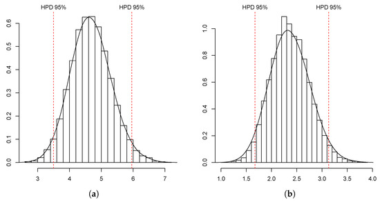 Estimated density for (a) and for (b), with 95% HPD (highest posterior density) sets.