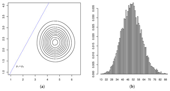 Given the data , we took a Bayesian approach in a non-parametric framework based on Markov chain Monte Carlo methods to estimate the key parameters and . In particular, we applied the Gibbs sampler algorithm proposed in [38], since a Y-linked pedigree two-sex BP could be regarded as a multi-type BP. To this end, we simulated 150 chains formed by 20,000 iterations of the method. According to the Gelman–Rubin–Brooks diagnostic tools, Five thousand was a sufficient burn-in period with a batch size of 200. In this way, we obtained a sample of size 11,400 from the conditional distribution of the parameter vector . Summary statistics for this posterior distribution are given in Table 2, and the estimates of its marginal density and joint density contour plot are presented in Figure 3 and the left-hand-side of Figure 4, respectively. We deduced that both growth rates were greater than unity, with that of R-type males, , being less than that of females and r-type males, , since our estimates were that and were approximately equal to unity and , with Bayes factors greater than unity.