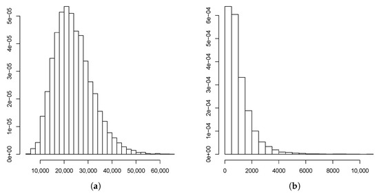 Finally, we evaluated the practical performance of the model against some real data. In particular, the model allowed us to study the evolution of Y-linked patterns associated with the real pedigree presented in [20]. From the observed sample given in that reference, which had the structure given in Equation (8), we estimated the parameters and using the Gibbs sampler algorithm proposed in [30] and deduced that there existed a positive probability for the hearing disorder not to disappear from the family even though the dominant allele was the one that transmitted normal hearing. The future population size of the total number of individuals of each type was estimated from the approximation of the predictive posterior distributions, indicative that the present results showed the usefulness of the model from a realistic perspective.