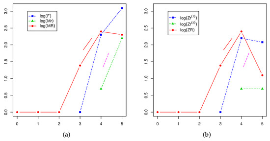 Finally, with respect to the growth rates in the cases of non-extinction, we derive from [35] geometric growths defined by and for each type of individual. Moreover, taking into account Daley’s scheme, the properties of the binomial distribution and the logarithmic conditions for and that are typical in branching process theory, i.e.,