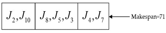 We first solved the IP formulation for the numerical example with 10 jobs by using Lingo 11, which takes a very long time, about 14 h. We obtained the optimal values for , , as shown in Table 2.