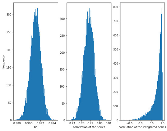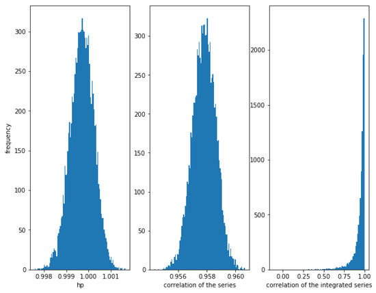 Figure 1 shows the histogram of the correlation between the series, the integrated series as well as the HP of the series for 10,000 simulations of correlated series and as described previously, with a length of 10,000. Please note that the correlation of the integrated series shows a wider dispersion than the correlation of the series itself.