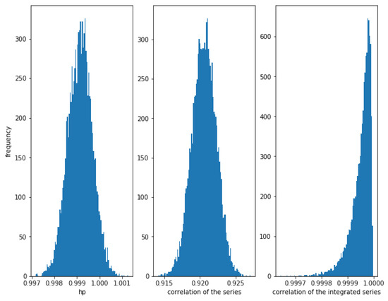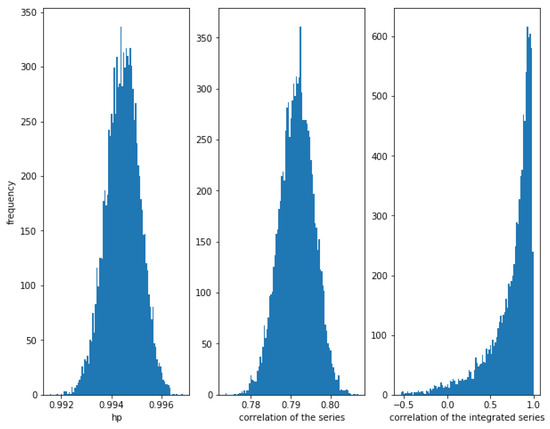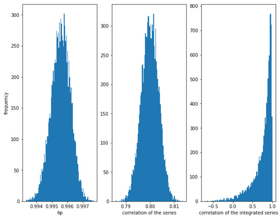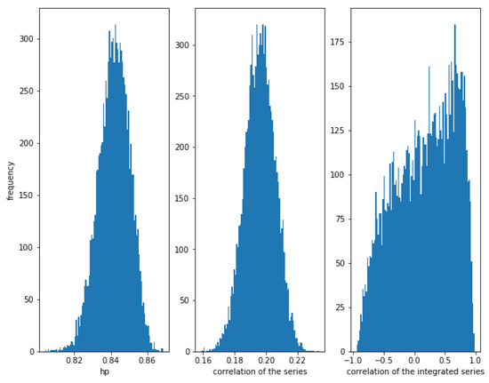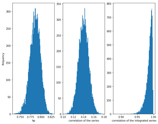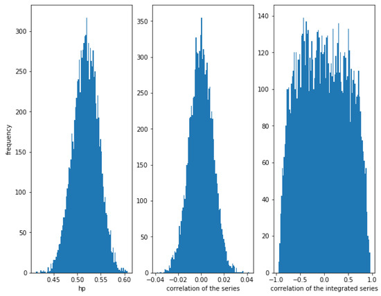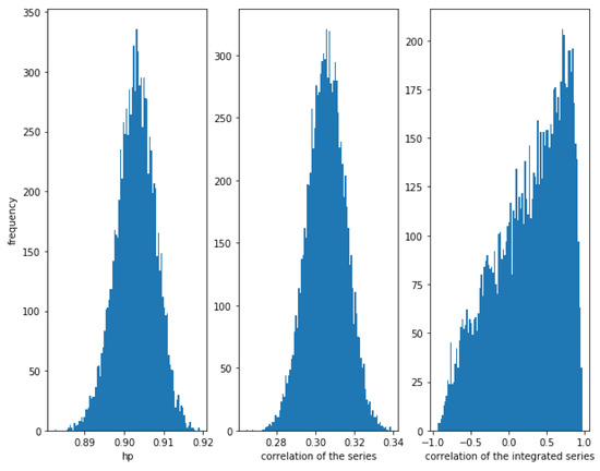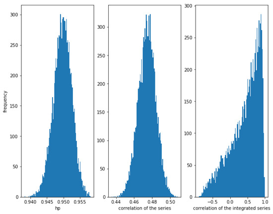 On the other hand, Figure 4 shows that when the noise is greater, i.e., for a greater value of (in this case ), the correlation between the series is weaker (≈0.14), though there is a relationship between them. The correlation of the integrated series is, as expected, very high with a narrow dispersion, in this case. The HP of the series is high (around ). Therefore, again, the HP is able to detect a relationship in the series.