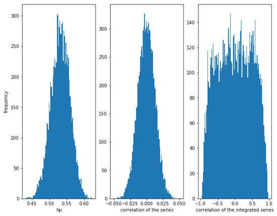 For , the correlation between the series is weaker (≈0.19), though there is a relationship between them. The correlations of the series and the integrated series are quite low (around the theoretical value), while the HP of the series is high (around ).