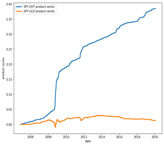 Figure 15 shows that ETFs SPY and VHT have, in fact, a great degree of co-movement, while in Figure 16, it is observed that ETFs GLD and VHT have a much lower degree of co-movement, as expected.