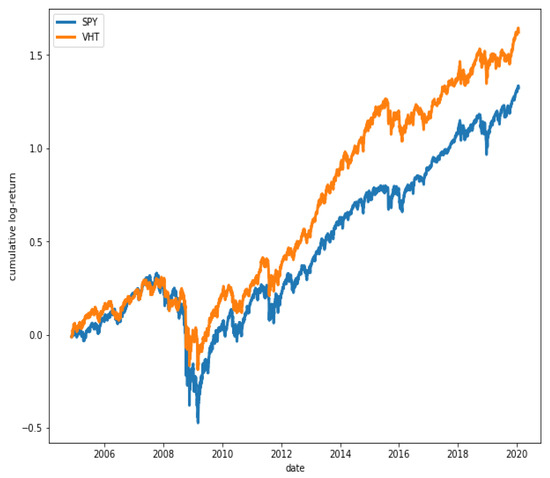 Cumulative log-returns of ETFs SPY and VHT. A high degree of co-movement is observed between the two series ().