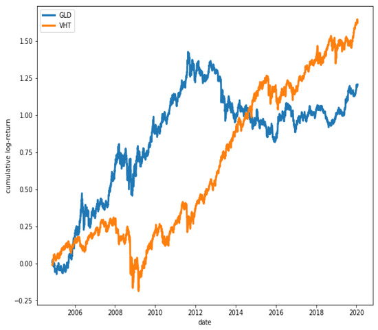 Cumulative log-returns of ETFs GLD and VHT. The degree of co-movement is low ().