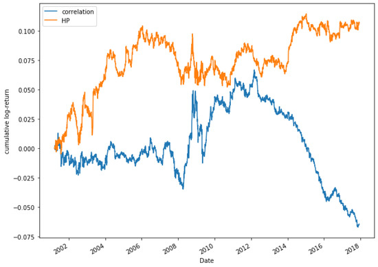 Comparative cumulative log-return of a 20-pair portfolio between HP (HP1 version) and Pearson’s correlation coefficient methods, of Dow Jones securities in the period 2000–2018.