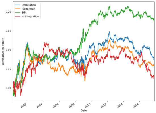 Finally, some other methods to measure correlations are compared in Figure 23, which shows a comparison of the accumulated log-return, for a portfolio composed of 15 pairs, among different methods to measure correlation (Pearson’s correlation coefficient, Spearman’s coefficient and cointegration) and our approach, for the stocks of the Dow Jones and in the period 2000–2018.