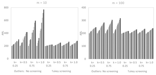 If , the in-control ARL values of CUSUM charts were approximately equal to the theoretical value of and indicates the absence of outliers in the Phase I sampled data. However, as the magnitude of increased, the non-screened data blew out of proportion, particularly when was small and . For example, if and , in Figure 2, the for the non-screened observations was 770 as against to 280 when the Tukey outlier detection model was applied. Even with the large values of and , the Tukey screened data appeared to be getting closer to the nominal value as increased. The same conclusion could not be made for non-screened data, as the in-control ARL values remained high when was relatively large (cf. Figure 2, Figure 3 and Figure 4). This means that the Tukey’s model would not only keep the on target but also maintain the performance of the CUSUM control chart. In general, we observed that the effect of was minimal when was small.