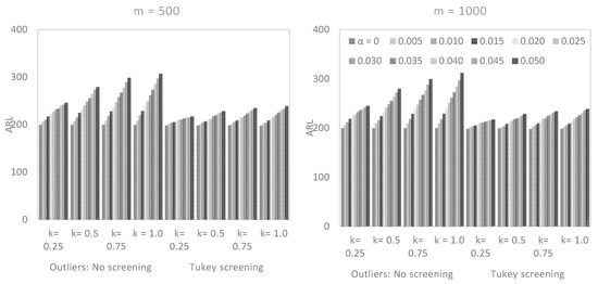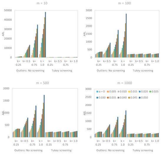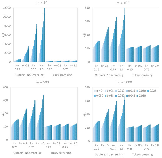 We saw earlier that the number of Phase I data, , did have a significant effect on the performance of a CUSUM chart. From Figure 2, Figure 3 and Figure 4, we saw that there was a vast difference in the reported between non-screened data and when the robust Tukey outlier detection model was applied to construct a CUSUM chart, particularly when was small. For example, in Figure 3, if and , the for non-screened data were in five figures while the corresponding Tukey screened data were relatively closed to the target value. Even an increase in the number of Phase I observations with no screening did not appear to have a significant impact on the chart’s performance as the outlier multiplier increased. The Tukey screened counterpart, however, was getting closer to the limiting value , as increased.