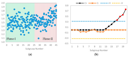 The RSS values of the chest-left ankle mote belonging to the cycling activity were clubbed into Phase I subgroups, and only the first 50 subgroups were used for the plotting purpose. Moreover, the first 25 subgroups based on the RSS values of chest-left ankle mote belonging to the standing activity were used as Phase II samples. The dataset of 75 subgroups is reported in Table 11. The process mean and standard deviation were estimated from the Phase I samples and found to be 16.9734 and 3.4764, respectively. These estimates were then used to construct the CUSUM chart for the Phase II samples. Figure 8a,b presents the scatter plot for the original data and the control chart output, respectively.