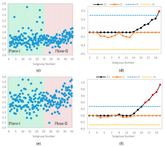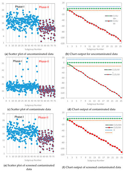 Finally, by using the above-mentioned contaminated Phase I data, we estimated the limit of the Tukey’s outlier detector, which was found to be . Now for any value, the absolute deviation from the median (i.e., ) greater than implies that the corresponding value is an outlier and needs to be screened from the data. Hence, by using the outlier detector, six observations were screened from the Phase I data. Further, the process mean and standard deviation were estimated and found out to be and , respectively. These new estimates were similar to the estimates of the original data and the scatter plot of the data is given in Figure 5e, which also showed upward trend in Phase II. In Figure 5f, the control chart is presented, which revealed that the there was no change in the limits, but the chart had detected an increase in the process mean at subgroup number sixteen.