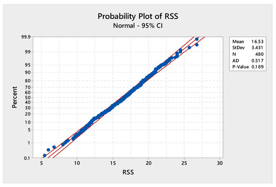 From this wireless sensor network, data was recorded on the actor’s activities such as; bending, cycling, standing, sitting, laying and walking. Further, for the first task of heterogeneous AReM, they considered activities such as cycling and standing. For the application purpose, we were concerned to detect a change in the pattern of RSS generated through the heterogeneous AReM setup. The AR time series dataset contained 480 observations in total, and each observation was obtained after 250 milliseconds. The average of RSS against the three IRIS motes (i.e., rss12, rss13, and rss23) was available in 15 different sequences of each activity. In our application, we considered the first sequence of the rss13 IRIS mote (chest-left ankle). The average of RSS of cycling was considered as in-control Phase I samples and average RSS of standing was considered as the out-of-control Phase II sample points. To access the normality of Phase I data set, we plotted a probability plot at the 95% confidence interval (cf. Figure 7) and also applied the Anderson–Darling test ( and ), which provided the evidence that the Phase I data set was normal.
