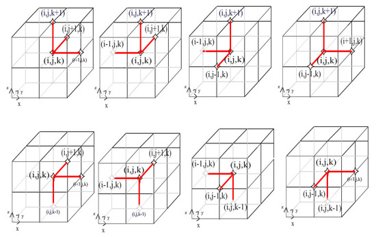 The computational procedure of the Interfaces I is depending on the use of GE method based on eight points per group. Similarly, we use the GE method based on four points per group to solve the Interfaces II between the inner boundaries of eight subspaces . Take one group of the Interfaces II for example to illustrate the order of the solution process. Figure 3 gives the direction of the iteration computation.