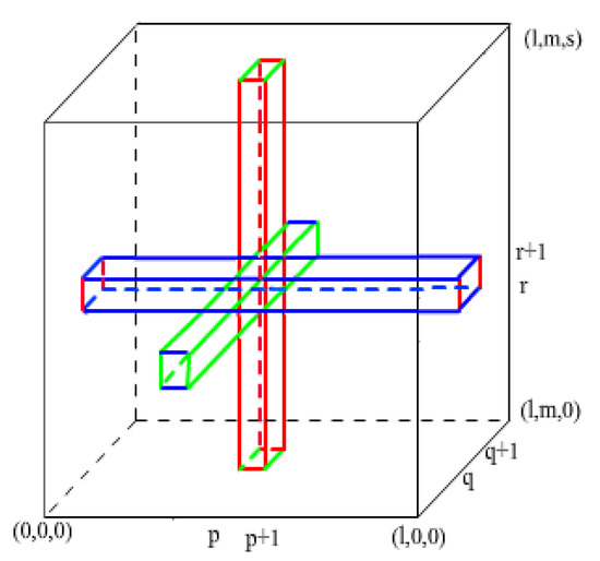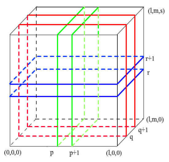 We can divide the 3D solution domain into multi-subdomains. For simplicity, we use six grid planes to discrete the solution domain into eight sub-domains, and note as subsets of grid points, while are positive integers with . Denote is the interfaces of the sub-domain . The sorting order of sub-domains is as follows: the subspaces above are sorted anticlockwise starting from the upper right sub-domain of the inner layer, and the sub-domains under are sorted anticlockwise starting from the lower right subspace (as shown in Figure 2). The specific description is as follows: