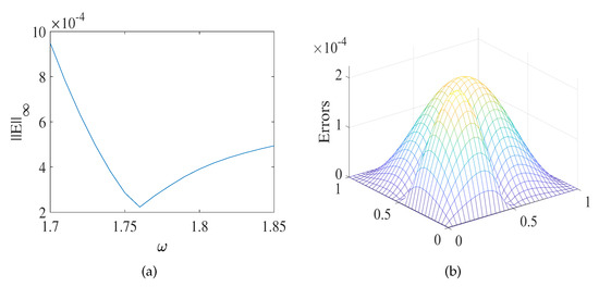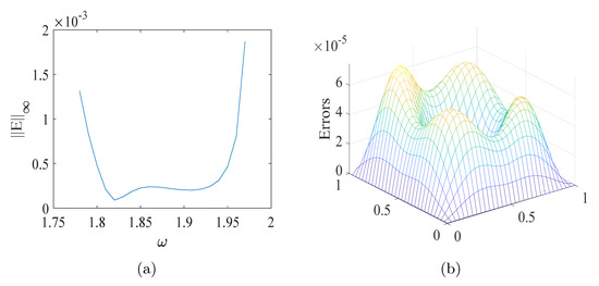 Table 1 gives the errors of the presented alternating asymmetric iteration algorithm based on domain decomposition for the 3D Laplace problem (37)–(38) with different values of when , we can obviously see that the errors is relatively smaller when the relaxation factor is about . we further see that the errors get the minimum when is about shown in Figure 4a, which is match with the result of Equation (35). Figure 4b performs the errors with when , which illustrate the effectiveness of the AAI algorithm.