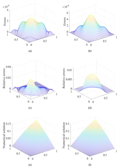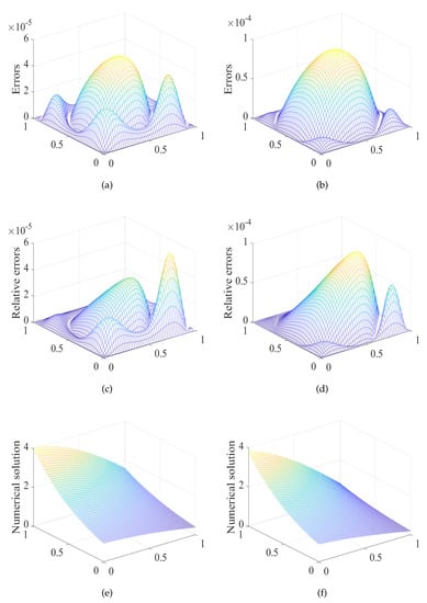 The errors and numerical solutions of the AAI algorithm when , . (a) The errors at ; (b) The errors at ; (c) The relative errors at ; (d) The relative errors at ; (e) The numerical solution at ; (f) The numerical solution at .