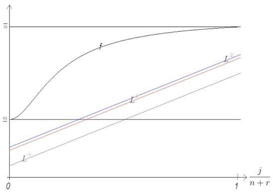 The linear least squares function in (9) and (11) is constructed from the Bernstein control points of a fixed degree n, , whereas just the convergence properties of the tight bound (11) is obtained by elevating the degree. In this subsection, we improve the linear least squares function to be computed from the control points of degree and then compute the maximum positive discrepancy between and the control points: